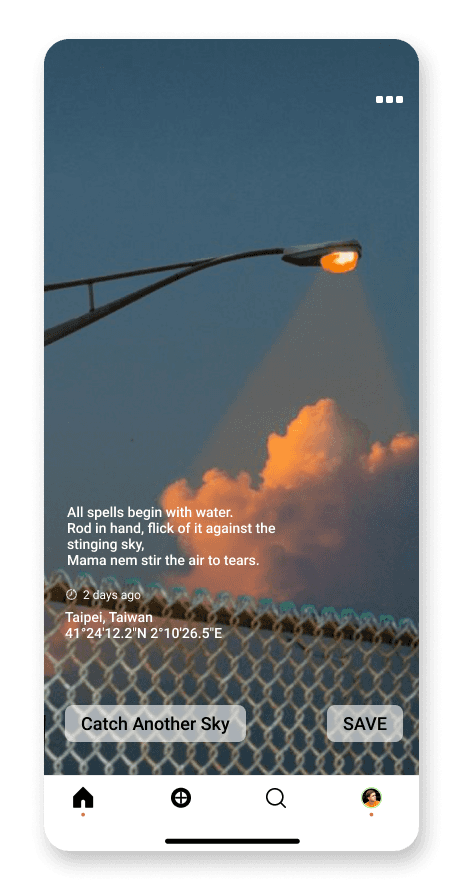 Users will receive an anonymous photo of a sky from anywhere around the world each day. To keep track of all of the skies, users can create albums according to their prefered genres.