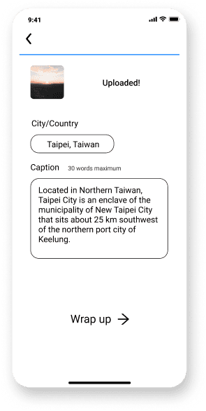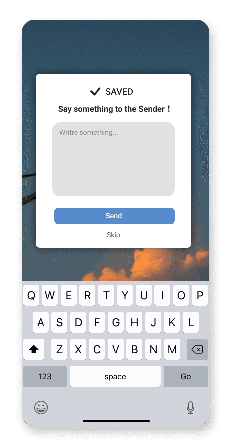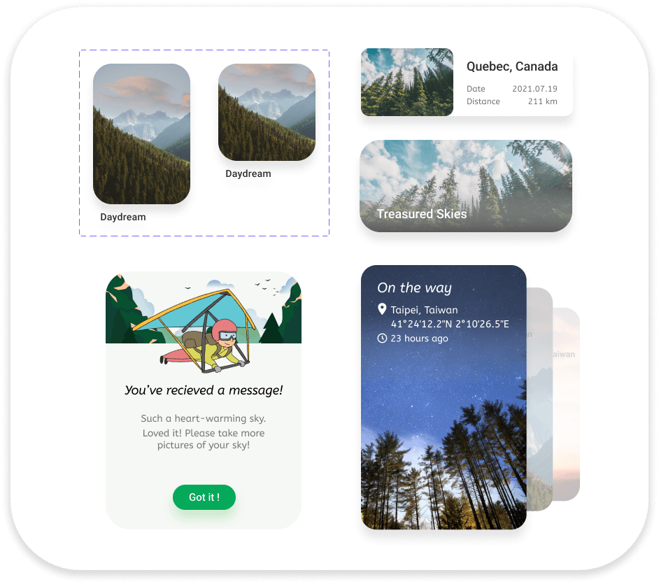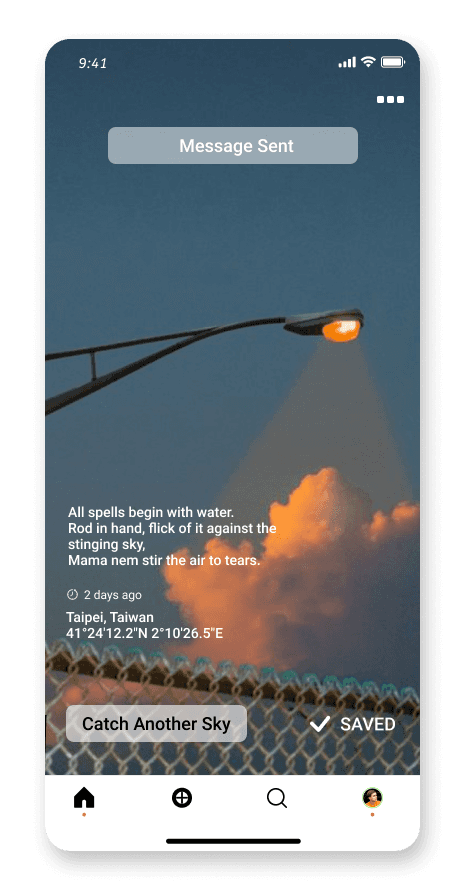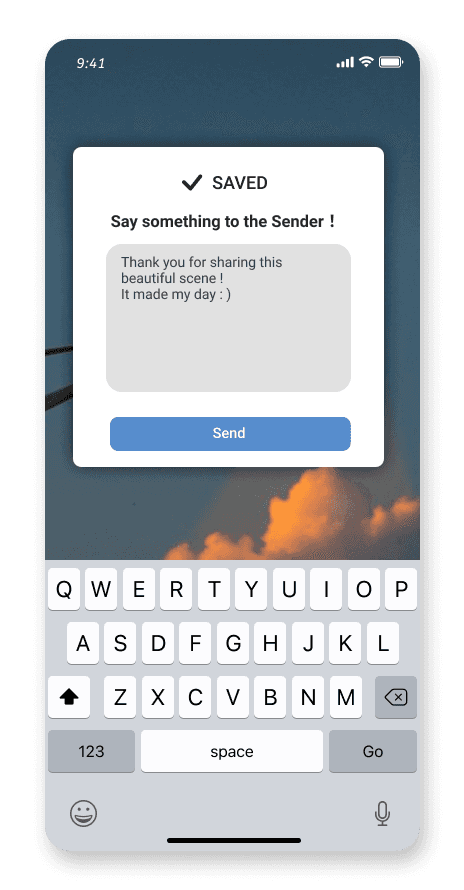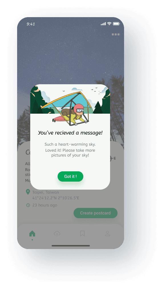 Users can receive surprising messages from people who received their picture of skies. The map view allows users to pin point the places where they send/received pictures of the sky to/from, as a way to keep track of their journey.