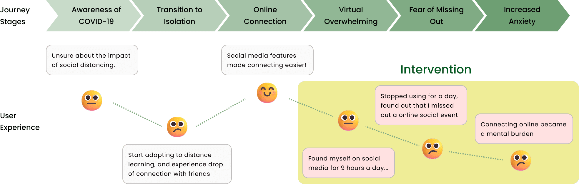 While multiple causes of lower mental health aroused during our research, we found that one common theme mentioned repetitively was the stress to actively engage in online socializing. We synthesized the cause and user needs that grew out of this pain point, and crafted out a detailed journey map, highlighting the challenges of a student navigating social connection during social distancing.