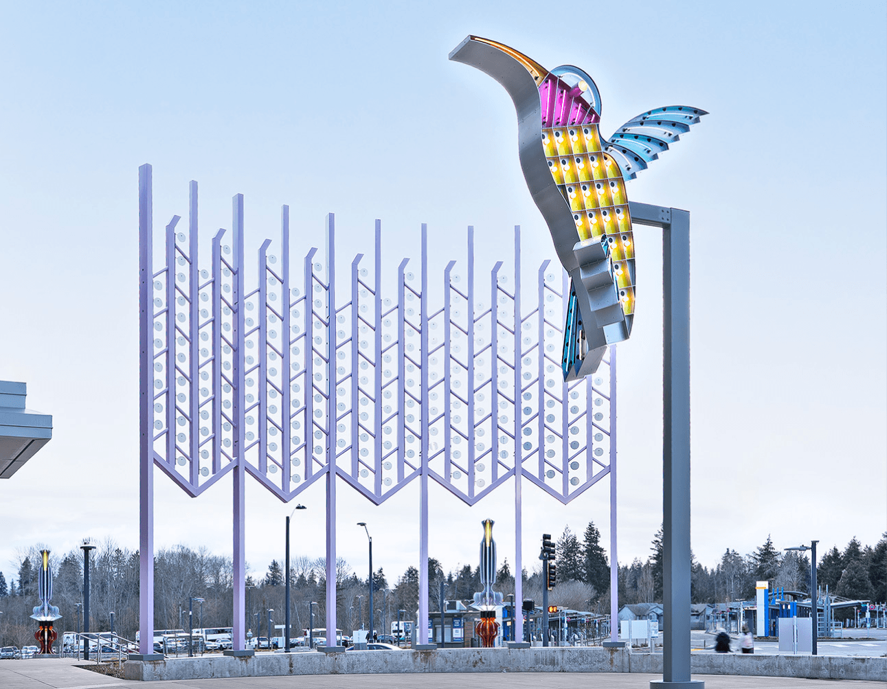 City Hummingbird honors the rich history of neon road signs that once lined Highway 99. Its companion, Kitchen Window Curtain, acts as its backdrop, turning the whole plaza into an enormous...