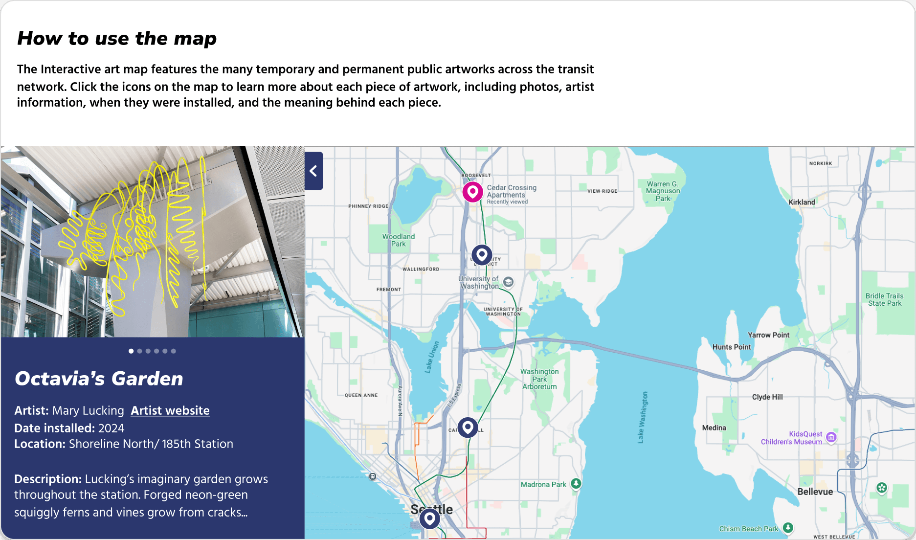 The interactive map allows users to explore the artworks along the transit lines interactively. This component will also be implemented in further development of the website!